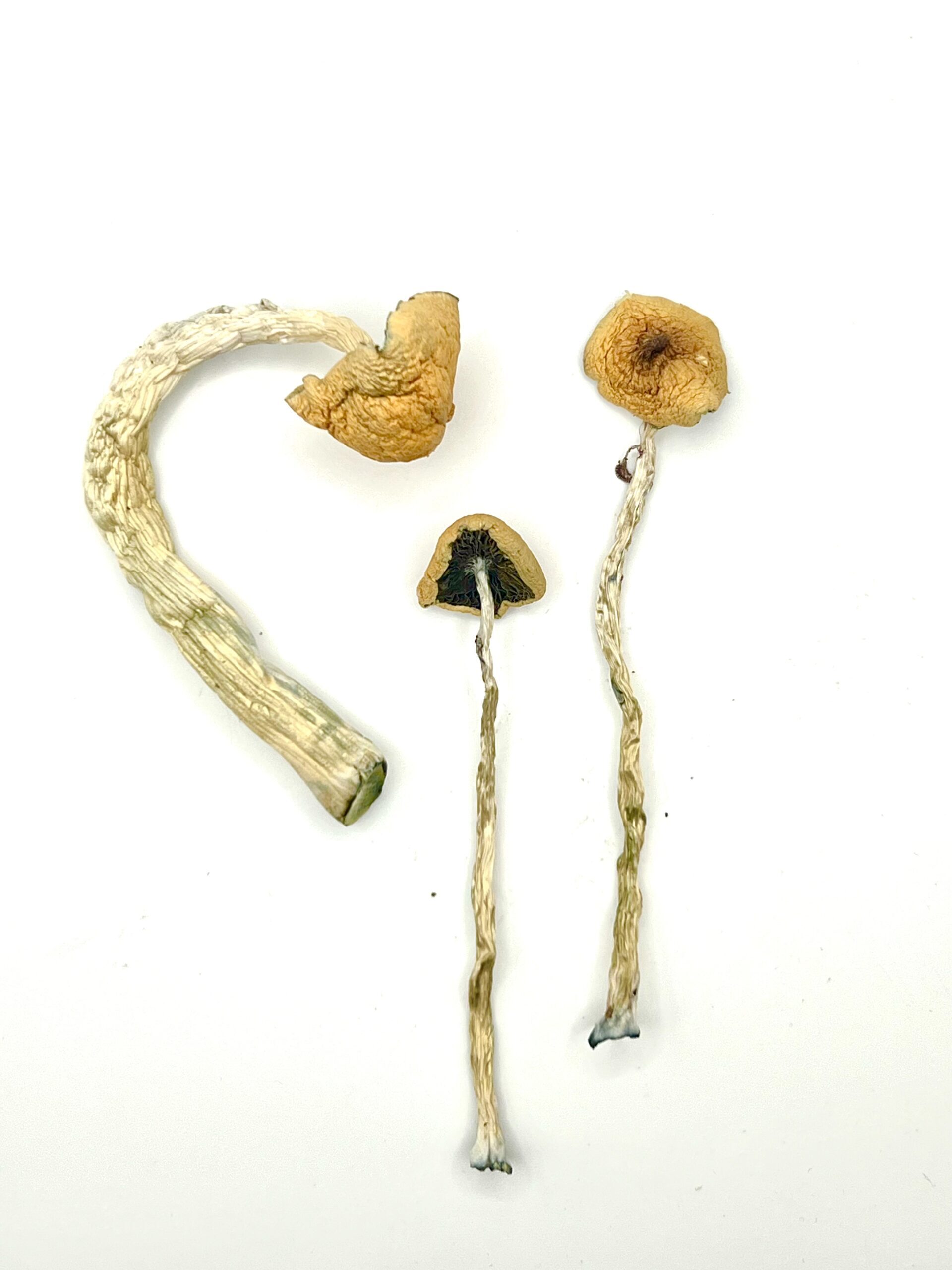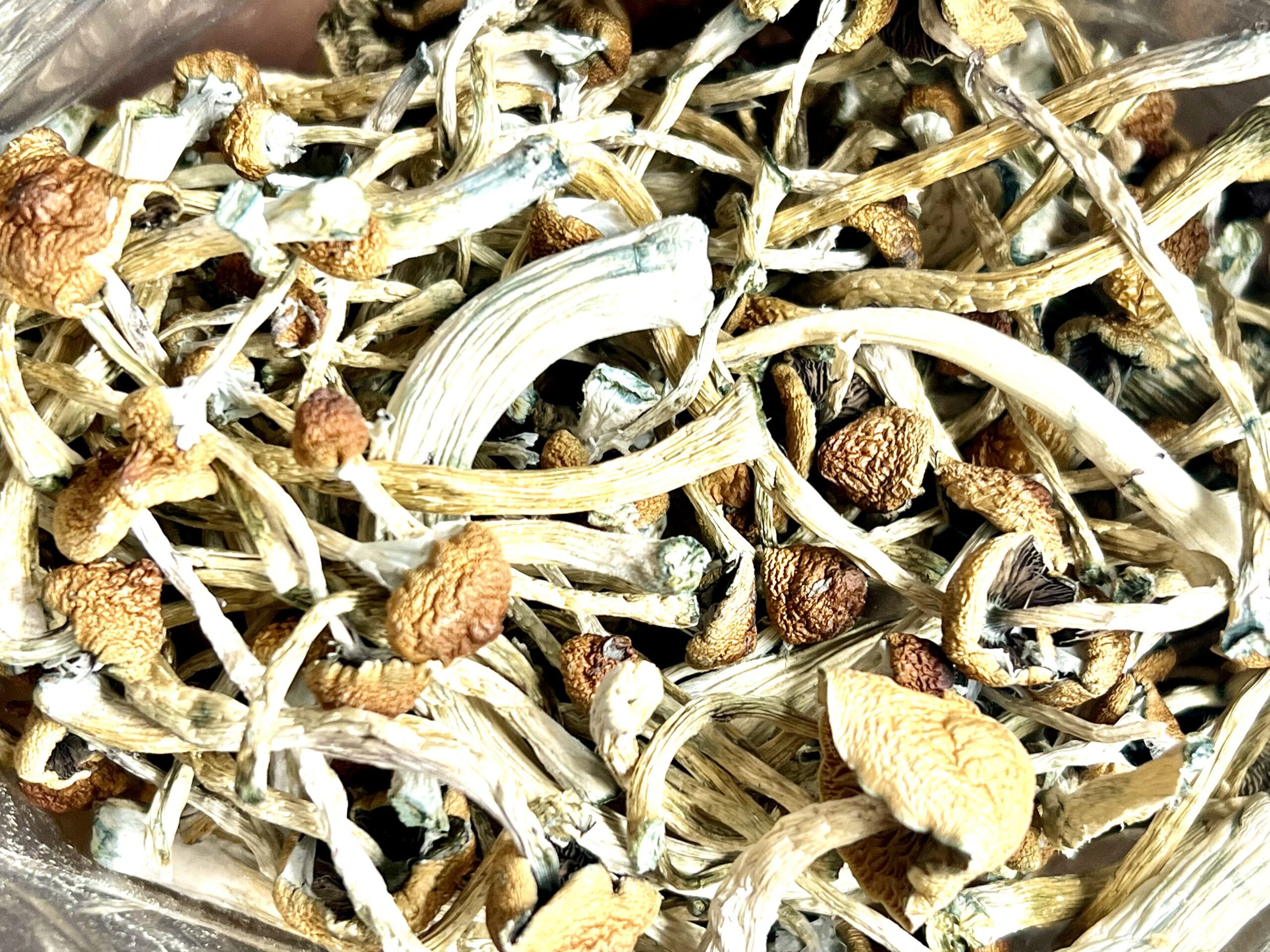 The Golden Hawk mushroom is a hybrid of the popular Golden Teacher and P.E. Hawk strains of Psilocybe cubensis. This variant is known for its robust growth and potency. The cap is golden and often displays a pronounced umbo at the center. It is sought after for both its educational value in mycological studies and its potential therapeutic uses. The Golden Hawk is particularly noted for its consistent flushes and larger-than-average fruiting bodies